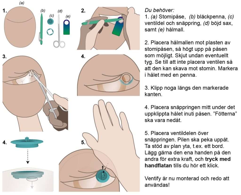 Lägg hålmallen på påsens övre halva och markera med en penna. Klipp längs markeringen. För in snäppringen i påsen med den platta sidan uppåt, och placera mitt under det uppklippta hålet. Placera ventildelen över snäppringen med pilen pekandes uppåt, och tryck till. När du hör ett klickande ljud är ventilen monterad och redo att användas!